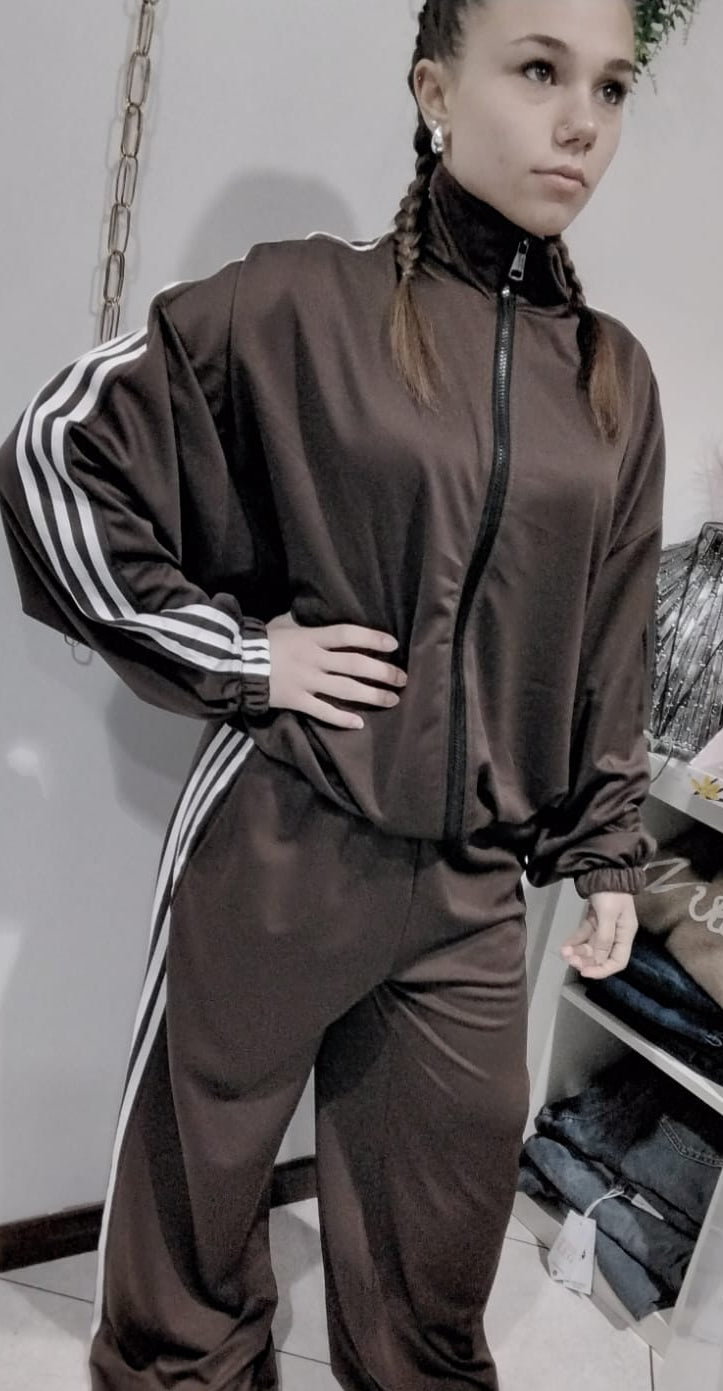 Questa Tuta over con bande laterali è perfetta per le taglie fino alla EU 50. Con il suo stile versatile, può essere indossata sopra un dolcevita in inverno o una t-shirt in primavera. Disponibile nei colori cioccolato e nero, è un must per ogni guardaroba.